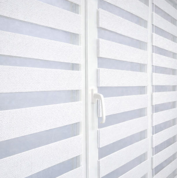Тканинні ролети день ніч складаються з горизонтальних смуг прозорої та непрозорої тканини. Через це їх у народі називають “Зебра”. Перевага цих систем над звичайними рулонними шторами в тому, що тут можна регулювати світловий потік шляхом зміщення прозорих смуг по непрозорим