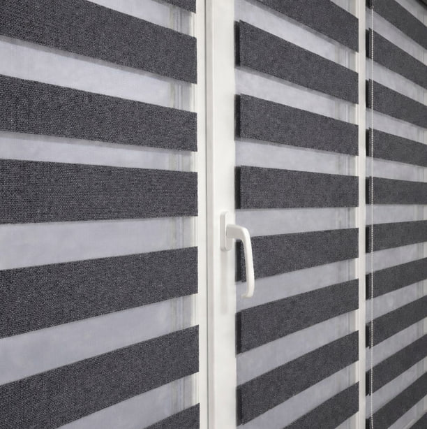 Тканинні ролети день ніч складаються з горизонтальних смуг прозорої та непрозорої тканини. Через це їх у народі називають “Зебра”. Перевага цих систем над звичайними рулонними шторами в тому, що тут можна регулювати світловий потік шляхом зміщення прозорих смуг по непрозорим